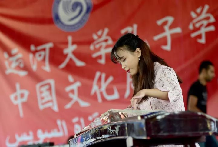 2017年10月31日,一名中国老师在苏伊士运河大学孔子学院中国文化周活动开幕式上演奏古筝。新华社记者 赵丁喆 摄