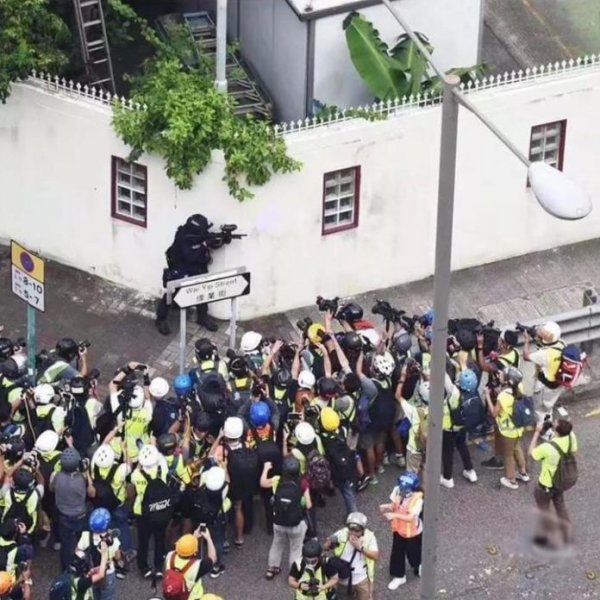 8月24日,一张数十名记者将“长枪短炮”对准一名正在执行任务的香港警察的照片引起网友们的一片愤慨,照片被网友冠之以“月度最佳”,建议提名新闻奖。事实上在近期反对派示威者发起一系列暴力示威活动,总是看到一些所谓的“记者”,他们只将镜头对准警察,而漠视暴徒,甚至为暴徒掩护。在昨天警方到场驱散示威人士时,大批媒体镜头对准警方行动,全程曝光;而当示威人士在破坏公物时,罕有媒体停驻记录,全程若无其事。而在昨天下午的时候,还有大批媒体人员阻碍关站,与警方爆发冲突,还有“黑衣人”用激光笔照射警察。