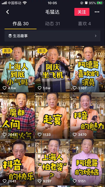 毛猛达刚开不久的抖音号,让他自己都没想到“都退休了,还能红一把”。其中沪语段子“上海风情”系列是涨粉关键,最受追捧的“上海人吃的没‘浇头’的是什么面”点赞超过4万。