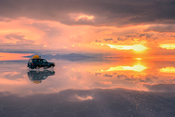传说中的天空之镜——位于南美洲玻利维亚的乌尤尼盐沼,一个面积一万平方公里巨大的高原盐沼,每年雨季,由于大量的降水不能及时流出,而汇聚成盐湖,但平均水深不足一尺,因此湖上可以行车,而旱季则又成为干涸的盐沼地。