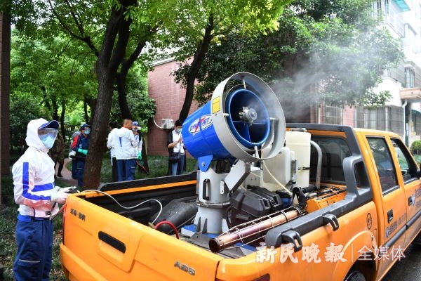 图说:徐汇区正南花苑请来专业虫害防治服务公司集中防蚊灭蚊 新民晚报记者 徐程 摄