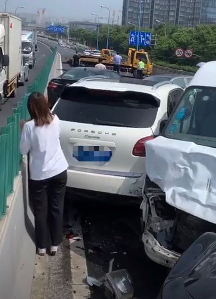 据了解,事故发生在上午9点多。当时一辆搅拌车在中春路由南向北方向高架下坡时,与前方6辆小客车发生碰撞,被撞车辆包括轿车、面包车和SUV。现场被撞车辆挤成一团,有车辆受前后左右夹击,车损比较严重,大灯及撞击后产生的碎片散落一地。由于事故车辆占据了现场仅有的2条车道,造成该路段后方车辆一度无法通行。