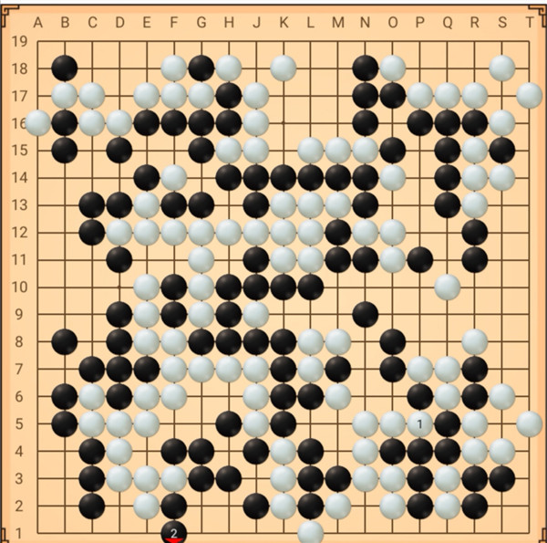 在大优形势下,王星昊白182还在黑阵中惹是生非,使得局面再次出现波澜,令网上观战的棋迷大为不解。棋局进行至黑205(如棋图),成为最后的胜负关键之处。此时,白棋只要在N7位提掉一颗黑子,依然是白棋的胜局。实战,王星昊白206(图中白1)“打吃”黑棋下出致命败着,屠晓宇机敏地“脱先”走了黑2立,形势逆转。因为,黑2立后,黑棋在自身做活的同时,白棋的“大龙”却危在旦夕,就这样,王星昊“煮熟的鸭子飞了”,十分可惜。