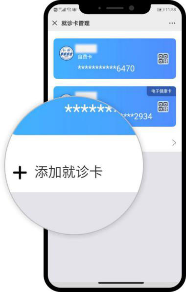 点击“自助服务”,选择当前卡片,进入就诊卡管理页面。点击“添加就诊卡”。