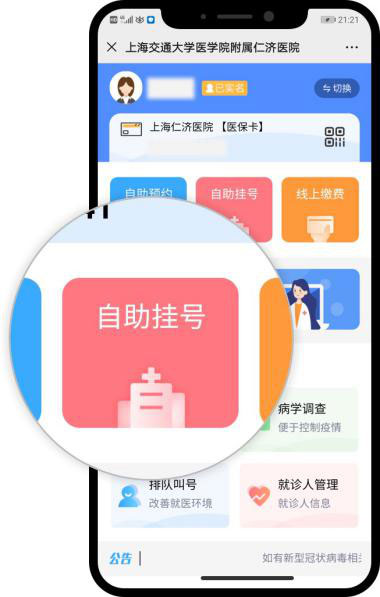 从公众号/支付宝生活号首页“自助挂号”入口选择科室,切换到医保卡,去挂号。