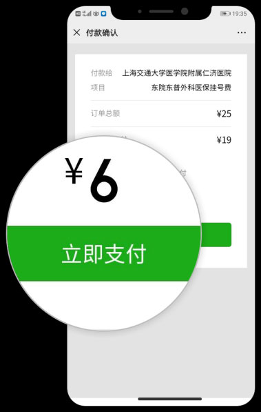 经过授权支付,系统返回当前挂号,订单总额¥25,医保可支付:¥19,个人支付:¥6,立即微信/支付宝支付。