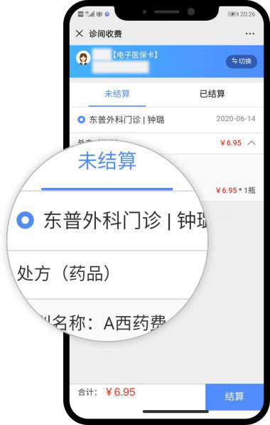 选中缴费处方,点击“结算”按钮,缴费提醒本次订单金额合计¥6.95,点击确认。
