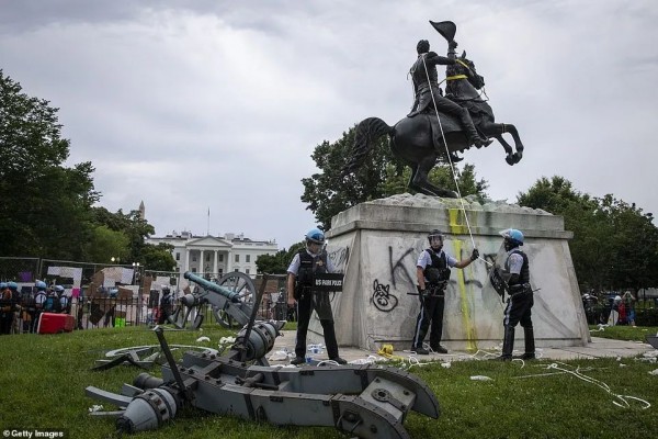22日,一些示威者戴着手套、背着铁链、越过围栏,来到白宫北侧的拉斐特广场,他们的目标是广场中心的那座杰克逊骑马雕像,以及附近的圣约翰公共教堂。一些人在雕像基座上喷上“杀人者”字样,还有人爬上基座、给杰克逊雕像的颈部和马的头部缠上绳索,准备拉倒这座雕像。