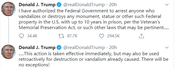 当地时间23日一早,特朗普在社交媒体上发推,称已经授权联邦政府逮捕破坏雕像者,最高可判处10年监禁。