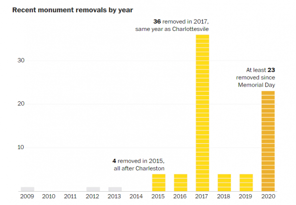 2017年8月弗吉尼亚州夏洛茨维尔的白人种族主义集会失控、升级为暴力冲突当年,36座纪念物被推倒。