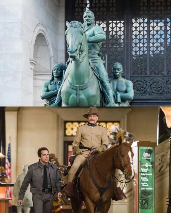 上图为美国自然历史博物馆门前的罗斯福雕像,下图为电影《博物馆奇妙夜》中在晚上复活的罗斯福雕像。