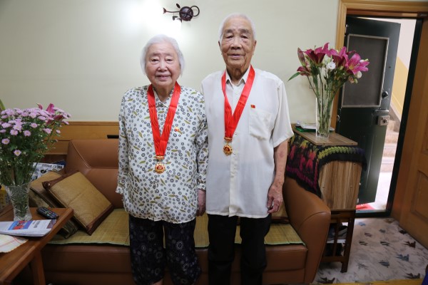 图说:有着64年党龄的高秀忠和老伴,双双戴上了“在党50年纪念章”。陆伟 摄