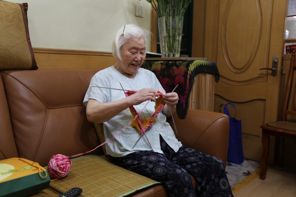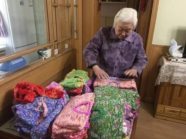 这几年,老人每天至少花两三个小时织毛衣。年纪大了,视力不好,老人几年前,双眼还做了白内障手术,但编织毛衣却没有停歇。有一次,老人去邮局寄毛衣,不当心摔倒,导致手骨折。休息一段时间后,她又编织起了毛衣。