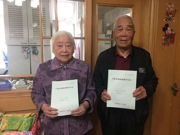图说:老两口到上海市红十字会登记遗体捐献,百年后无偿捐献全部器官。侍荃 摄