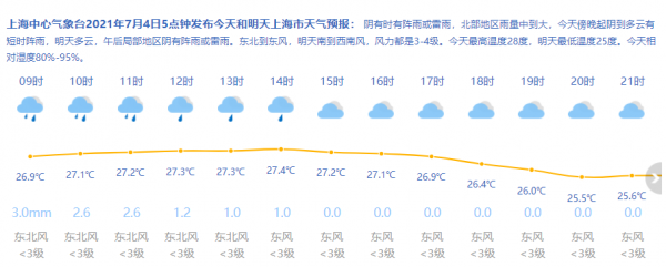上海中心气象台2021年7月4日5点钟发布今天和明天上海市天气预报:阴有时有阵雨或雷雨,北部地区雨量中到大,今天傍晚起阴到多云有短时阵雨,明天多云,午后局部地区阴有阵雨或雷雨。东北到东风,明天南到西南风,风力都是3-4级。今天最高温度28度,明天最低温度25度。今天相对湿度80%-95%。