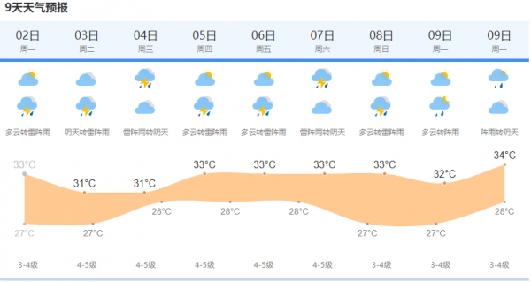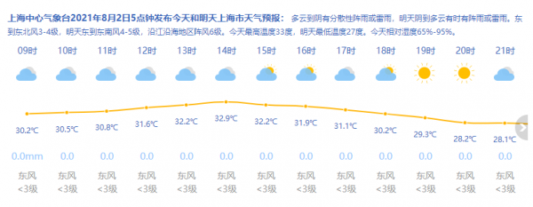 上海中心气象台2021年8月2日5点钟发布今天和明天上海市天气预报:多云到阴有分散性阵雨或雷雨,明天阴到多云有时有阵雨或雷雨。东到东北风3-4级,明天东到东南风4-5级,沿江沿海地区阵风6级。今天最高温度33度,明天最低温度27度。