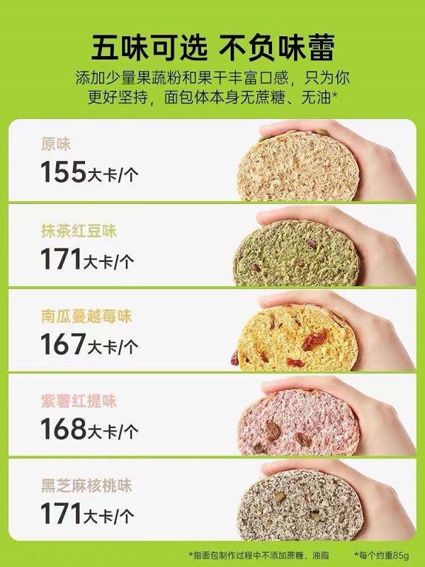 宣传页面显示,1个原味面包的热量才155大卡。但测试显示,这款面包实际含有能量1060÷100*85=901千焦。按1大卡=4.19千焦换算,该面包实际热量为901÷4.19≈215大卡,远远超过了标称。如果消费者按照商品标称来计算食用数量,那很可能多吃下好多热量,从而变“减肥”为“增肥”。