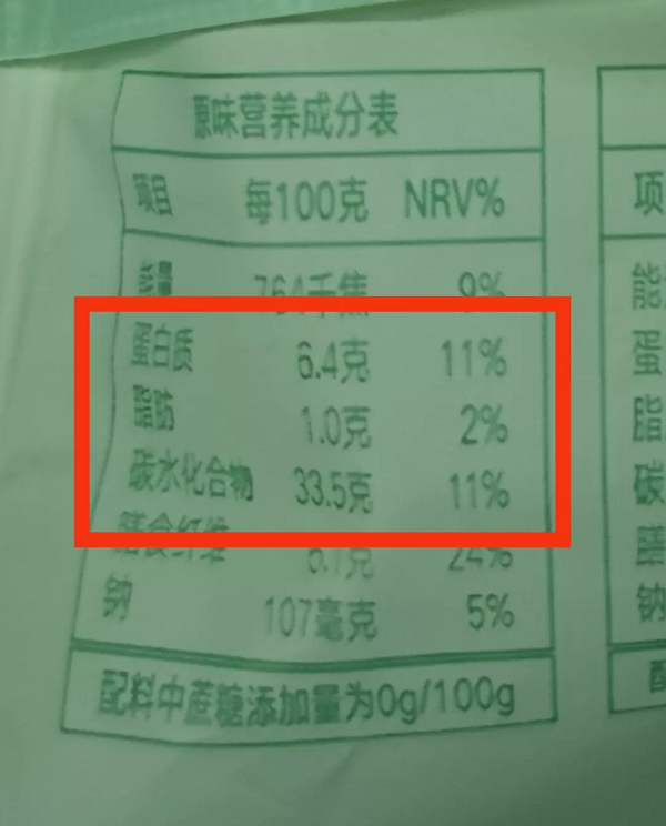 然而,看了成分表后,消保委专家感到有些奇怪。包装上写着,蛋白质6.4克/100克、脂肪1.0克/100克、碳水化合物33.5克/100克、膳食纤维6.1克/100克、钠107毫克/100克,总和为47.107克/100克,占比约为47.1%,不到总量的一半。