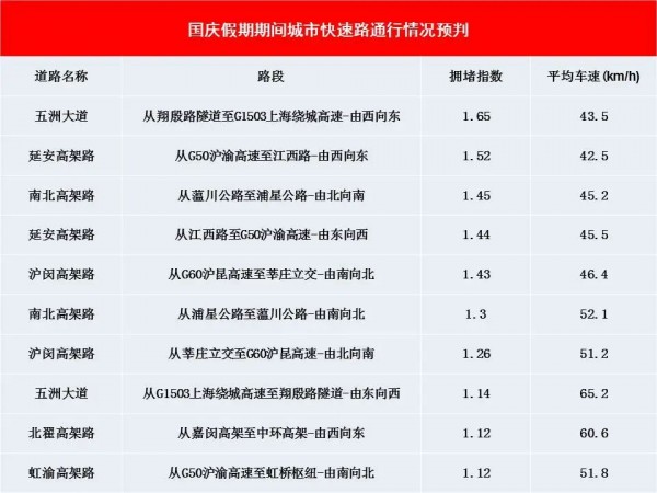 经预测,国庆假期本市易发生拥堵的城市快速路为五洲大道(从翔殷路隧道到G1503上海绕城高速入口-由西向东)、延安高架路(从G50沪渝高速到江西路-由西向东)、延安高架路(从江西路到G50沪渝高速-由东向西)。