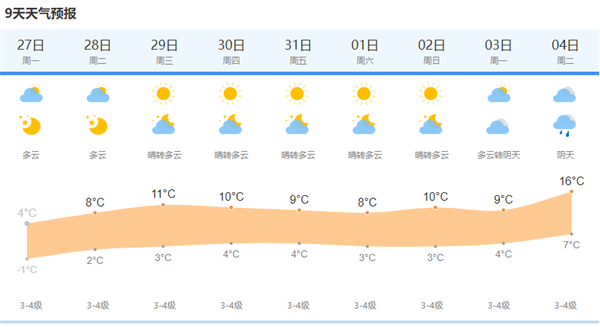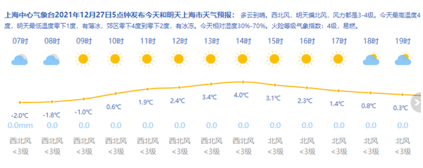 上海中心气象台2021年12月27日5点钟发布今天和明天上海市天气预报:多云到晴。西北风,明天偏北风,风力都是3-4级。今天最高温度4度,明天最低温度零下1度,有薄冰,郊区零下4度到零下2度,有冰冻。