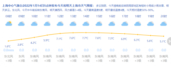 上海中心气象台2022年1月14日5点钟发布今天和明天上海市天气预报:多云到阴,今天傍晚前后转阴局部地区有短时小雨或小雨夹雪,明天多云。东北风,今天中午前后转东南风,明天偏西风,风力都是3-4级。今天最高温度8度,明天最低温度4度。