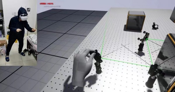 没有办法到实验室,怎样才能找到实验室操作的感觉呢?物理与天文学院的博士生严增泉想到,可以借助VR虚拟现实设备和“元宇宙”概念,在虚拟世界中映射实验设备,并通过体感手势交互实现对虚拟实验器件的调控,达到线上实验的目标。他设定与实验器件匹配的抓握、移动、旋转等手势识别交互功能,加入实时光学仿真模拟呈现精致的光学实验现象,再通过头戴显示器,实现沉浸式的线上实验。不光是物理光学实验,一个头戴显示器和一台笔记本电脑还能扩展到化学、电子线路和工程类实验。严增泉对这套虚拟装置很有信心,未来如果利用低成本的深度相机结合“数字孪生”技术,对各实验室进行大尺度的超清三维实景重构,将数字孪生的实验室对象整合至线上平台,还有可能实现对校内实验室的线上沉浸式交互与导览,实验人员也许远程就可以对实验室内的器件进行实体操作。
