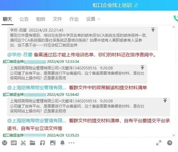 封控期间,为畅通线上培训咨询沟通渠道,虹口区在网上开设了“企业线上培训”QQ群,方便企业通过入群留言的方式,根据需要下载申报备案的相关表式与材料模板。工作人员确保每天上、下午各登录一次,集中回复企业留言。截止到目前,此轮疫情封控期间,已答复企业留言300余条,回复电子邮件70余封。虹口区就业促进中心相关负责人介绍,线上培训不同于传统培训,制定培训方案时结合了线上教学特点,合理安排授课时间与授课形式,利用互联网优势,加强教学互动与答疑,提高了培训学员的参与度。培训方案中包含在线上实现的评价测试环节,设定了标准化的评价测试内容和培训合格指标,量化培训成果评估。
