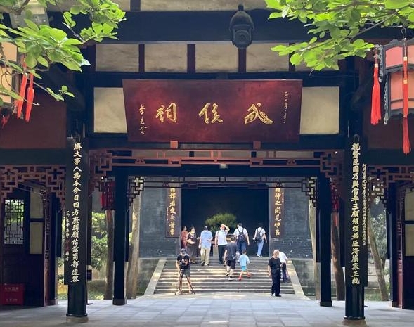 武侯祠门口赫然竖立着清人赵藩撰写的“攻心联”:能攻心则反侧自消,从古知兵非好战;不审势即宽严皆误,后来治蜀要深思。寥寥数语,既高度肯定了诸葛亮善于用兵、理政的才华,又从和战、宽严的辩证关系总结了诸葛亮治蜀的经验。同时还隐约暗指了诸葛在国弱兵疲时北伐带来的弊端与诟病。