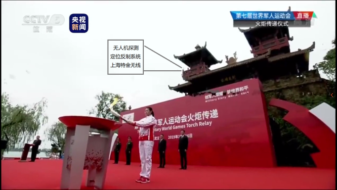 特金参与保障武汉2019年世界军运会活动,图为央视开幕式报道截图,特金设备即位于图中古建筑上