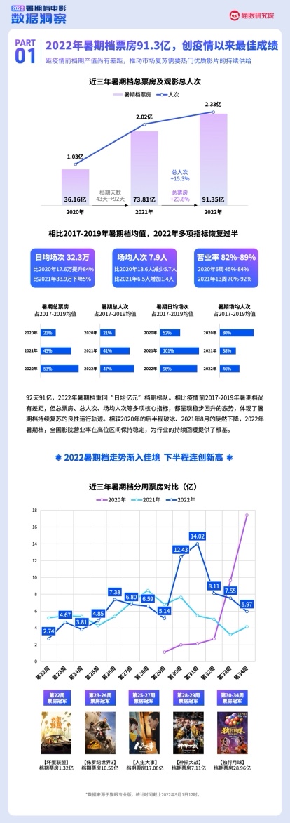92天91亿,2022年暑期档重回“日均亿元”档期梯队——随着开学季的到来,电影暑期档也正式落下帷幕。今天下午,猫眼研究院发布“2022暑期档数据洞察”,虽然相比疫情前同期尚有差距,但总票房、总人次、场均人次等多项核心指标,都呈现稳步回升的态势。相较2020年的后半程破冰、2021年8月的陡然下降,2022年的暑期档,全国影院营业率在高位区间保持稳定,为行业的持续回暖提供了根基。