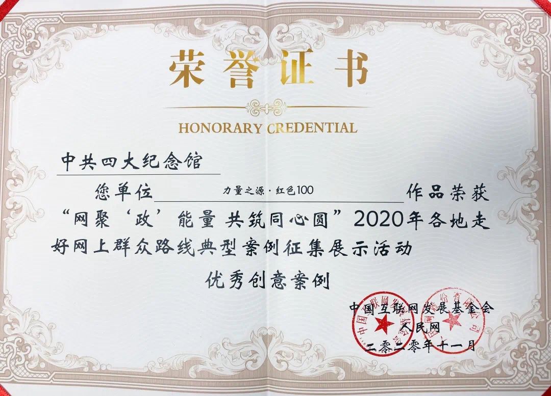 2020年,由中央网信办网评局指导、中国互联网发展基金会和人民网联合开展的“网聚‘政’能量共筑同心圆”——各地走好网上群众路线典型案例征集展示活动评选结果公布,中共四大纪念馆“力量之源·红色100”项目荣获优秀创意类案例。前两季40集分别在本馆官微、学习强国、抖音、B站播放,近期又在官方视频号上线,视听率达100万人次。