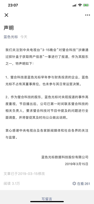 15日晚间,璧合科技股份有限公司背后的股东蓝色光标快速对此事回应,璧合科技是蓝色光标早年参与财务投资的企业,蓝色光标不占有其董事席位,也未参与其日常运营决策。作为璧合科技的股东,蓝色光标要求璧合科技对节目中提及的问题进行全面调查,并将督促其及时向公众做出说明。