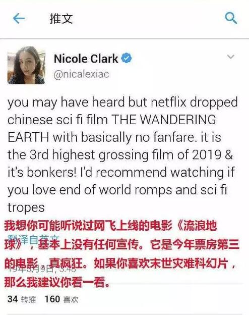 悄悄地上线背后可能有平台方面自己的考虑,不过这也显然导致观影人数的下降,幸好仍然有国外网友观看电影后为小破球自发宣传,号召更多的人去看这部电影。比如知名媒体人Nicole Clark在推特上写道:“我想你可能听说过Netflix上线的电影《流浪地球》,基本上没有任何宣传。它是今年票房第三的电影,真疯狂。如果你喜欢末世灾难科幻片,那么我建议你看一看。”