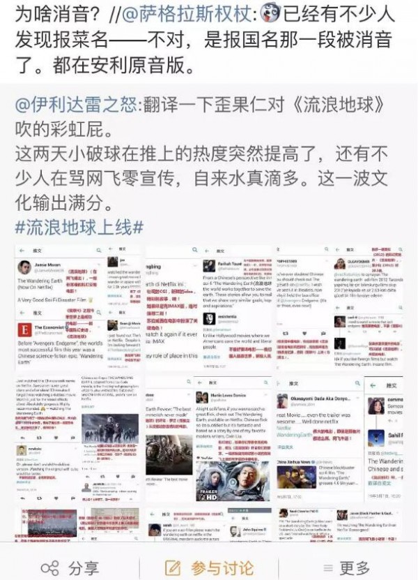 而对于Netflix的消音处理,有网友们认为这是平台方暗搓搓搞中国威胁论,“把各国联合救援消音了,只看字幕就是中国拯救地球——大概的效果是中国拍了部中国拯救地球的片子——意思是中国拍这部电影就是洗脑中国国民和外国人,红色输出”。
