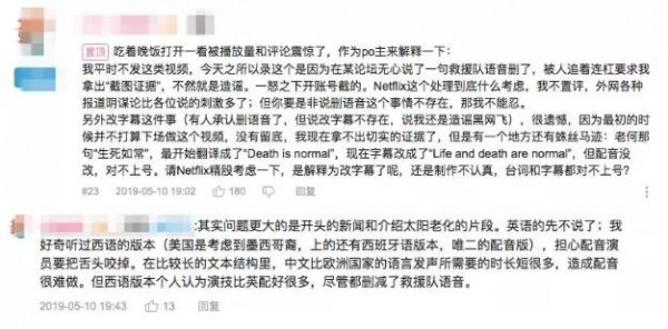这位up主表示,Netflix这个处理到底什么考虑,我不置评,外网各种报道阴谋论比各位说的刺激多了;但你要是非说删语音这个事情不存在,那我不能忍。另外改字幕这件事(有人承认删语音了,但说改字幕不存在,说我还是造谣黑网飞),很遗憾,因为最初的时候并不打算下场做这个视频,没有留底,我现在拿不出切实的证据了,但是有一个地方还有蛛丝马迹:老何那句“生死如常”,最开始翻译成了“Death is normal”,现在字幕改成了“Life and death are normal”,但配音没改,对不上号。
