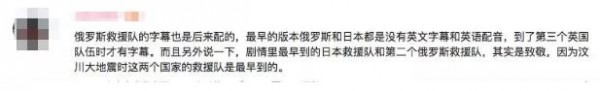 有网友对这位up主表示了支持,并指出:“俄罗斯救援队的字幕也是后来配的,最早的版本俄罗斯和日本都是没有英文字幕和英语配音,到了第三个英国队伍时才有字幕。而且另外说一下,剧情里最早到的日本救援队和第二个俄罗斯救援队,其实是致敬,因为汶川大地震时这两个国家的救援队是最早到的。”