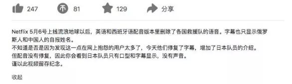 不知道是不是因为抱怨的人太多了,5月10日,Netflix又紧急修复了字幕,增加了日本队员的介绍,但配音依旧没有修复,因此观众会看到日本队员只有口型和字幕显示,但没有声音。