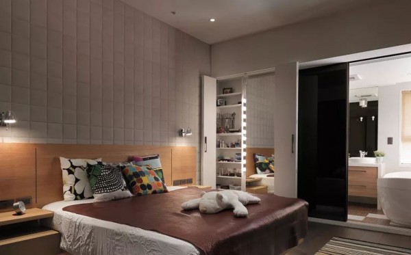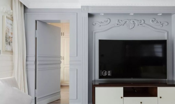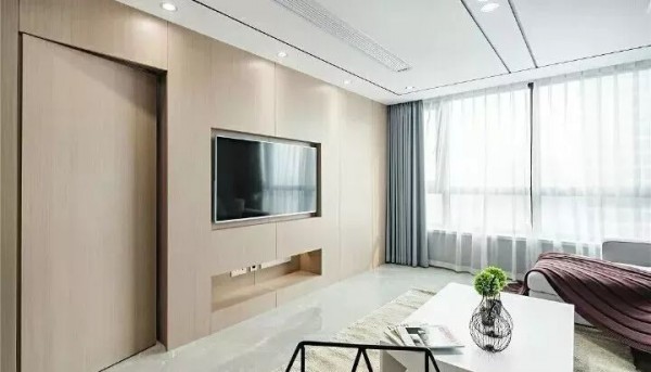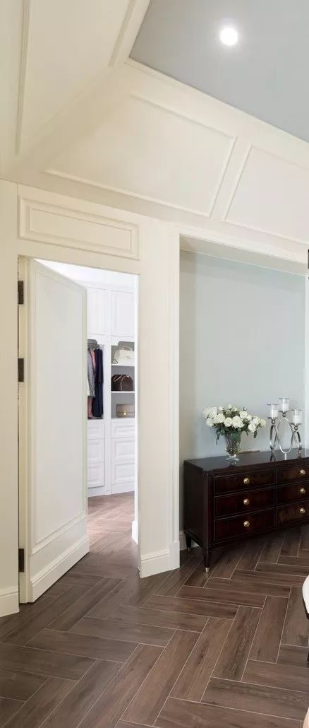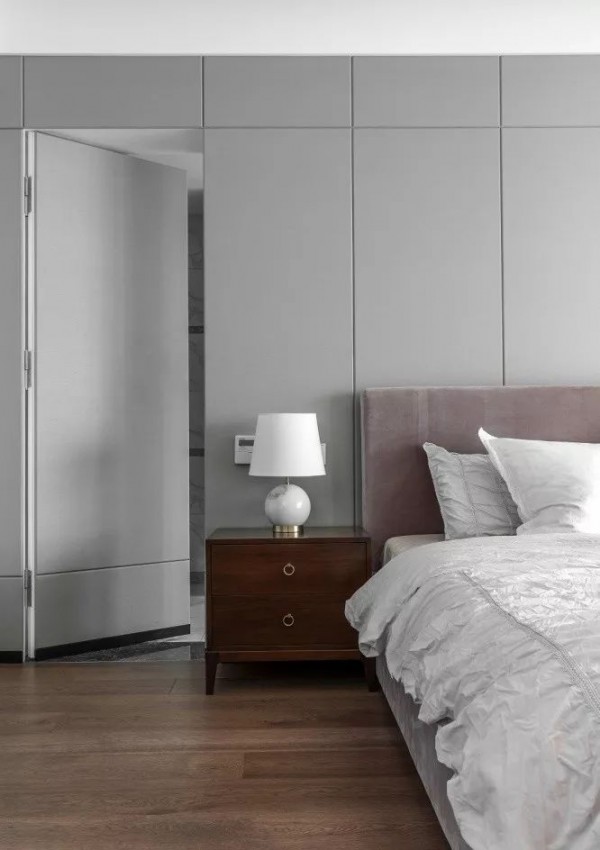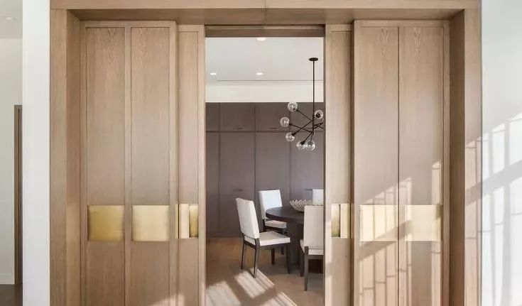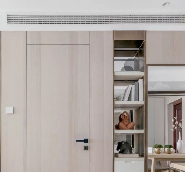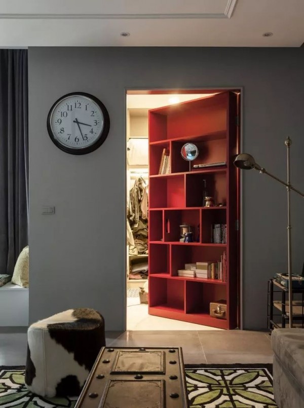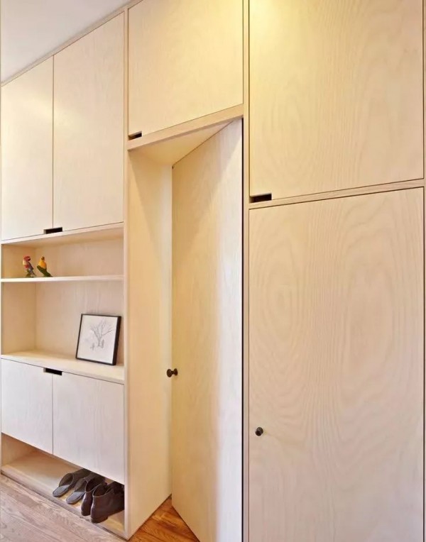 可以在家里通顶的大柜子中,做一扇门隐藏其中。比如下面客厅一整面的通顶大柜子中,藏着一扇通往卧室或者卫生间的门。