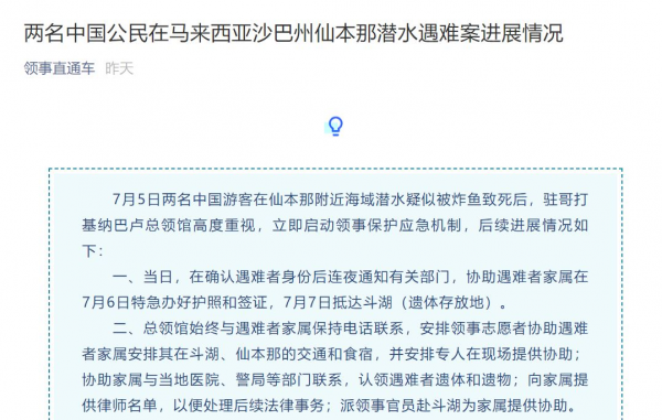 10日,中国驻哥打基纳巴卢总领事馆发布消息称,遇难者所乘游船船长和船夫已归案,但尚未抓到炸鱼者。虽然目前案件仍在调查过程中,但是马方已在出事海域发现有土制炸弹的碎片,而且遇难者潜水装备严重损坏,附近区域有大量死鱼,海底珊瑚礁也被严重破坏。