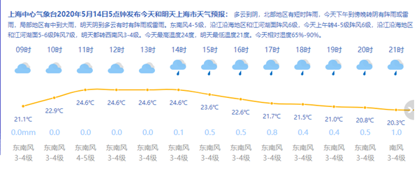 【新民晚报·新民网】多云到阴,北部地区有短时阵雨,今天下午到傍晚转阴有阵雨或雷雨,并可能伴有雷电、大风和短时强降水等强对流天气。局部地区有中到大雨,明天阴到多云有时有阵雨或雷雨。东南风4-5级,沿江沿海地区和江河湖面阵风6级,今天上午转4-5级阵风6级,沿江沿海地区和江河湖面5-6级阵风7级,明天都转西南风3-4级。今天最高温度24度,明天最低温度21度。今天相对湿度65%-90%。