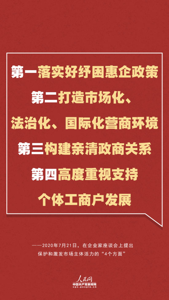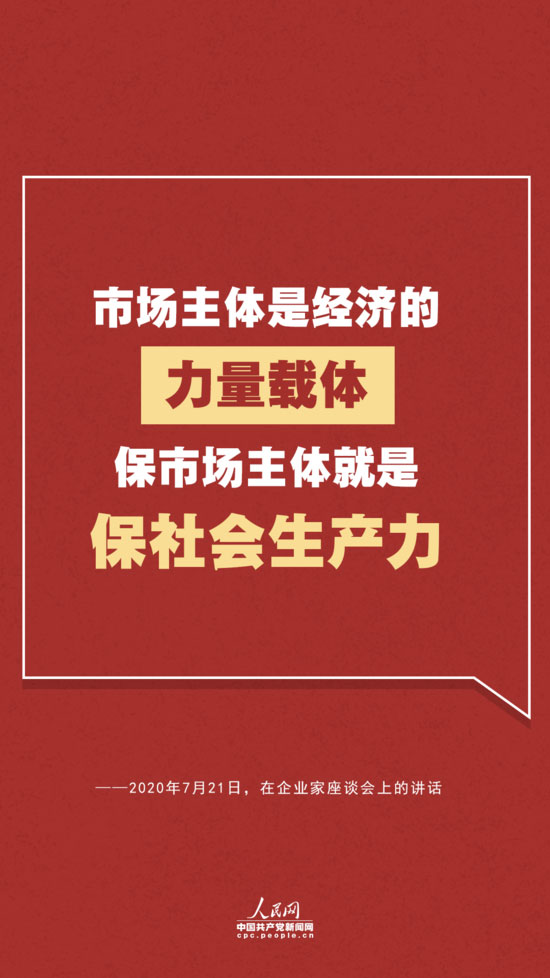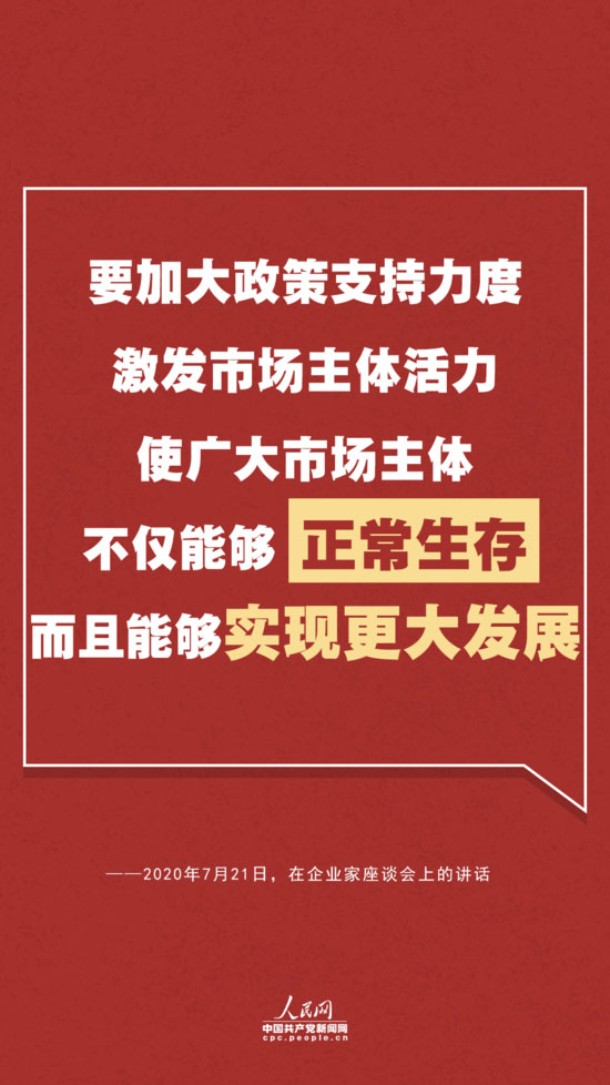 习近平强调,党中央明确提出要扎实做好“六稳”工作、落实“六保”任务,各地区各部门出台了一系列保护支持市场主体的政策措施。下一步,要加大政策支持力度,激发市场主体活力,使广大市场主体不仅能够正常生存,而且能够实现更大发展。