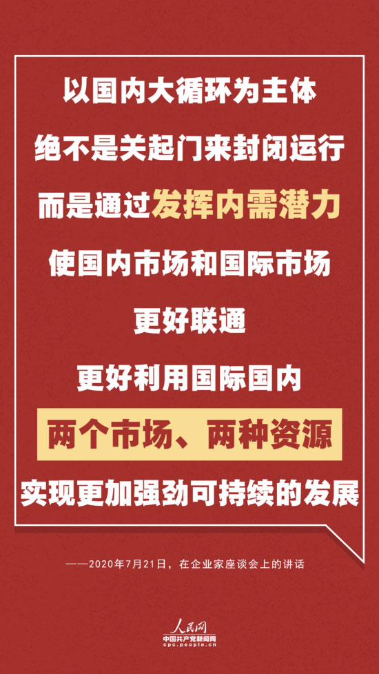 ·以国内大循环为主体,绝不是关起门来封闭运行,而是通过发挥内需潜力,使国内市场和国际市场更好联通,更好利用国际国内两个市场、两种资源,实现更加强劲可持续的发展。