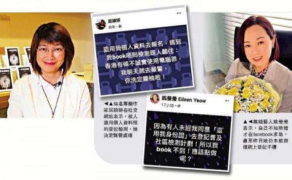 专栏作家屈颖妍、无线艺人姚莹莹发现自己的身份证号码被人盗用去预约普检 图 | 香港《大公报》