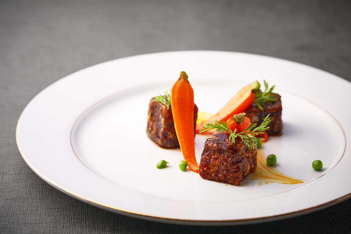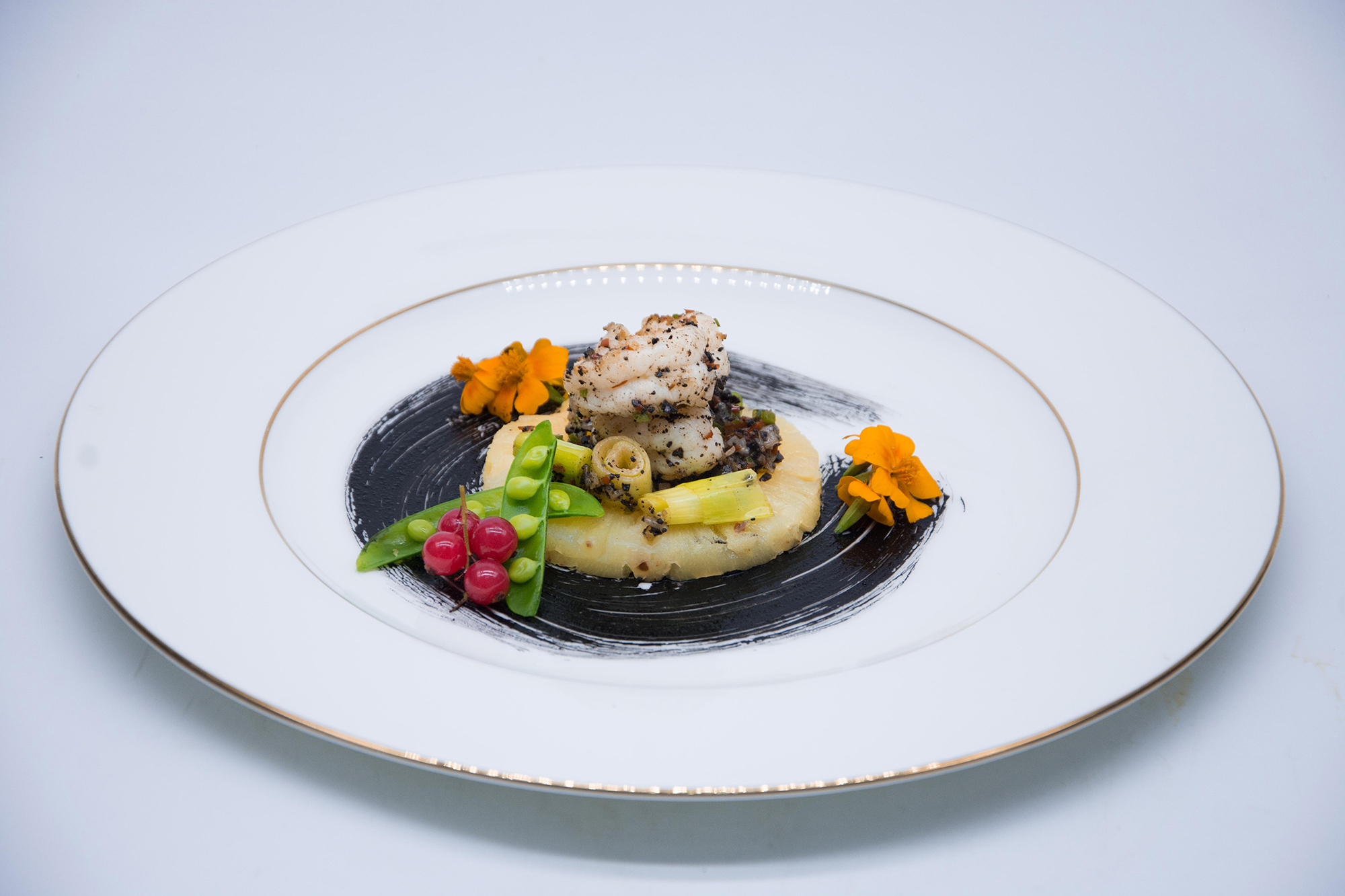 将小青龙去壳取肉,洗净后加干邑进行腌制,随后入油锅拉油直至成熟,这个过程火候把握非常重要,直接决定了小青龙最后的口感。黑松露遇上小青龙,强强联手势必不凡,将小青龙虾肉的甜美和黑松露的香气最大程度地体现出来。龙虾尚未上桌,浓郁的黑松露香气遇热弥漫开来,龙虾肉蜷缩在一起,洁白的虾肉上包裹着一颗颗芝麻大小的黑松露。咬下的瞬间,黑松露伴随着干邑的香气突破口腔直至鼻腔反复循环,龙虾肉紧实富含韧劲,咀嚼过后鲜甜四溢。