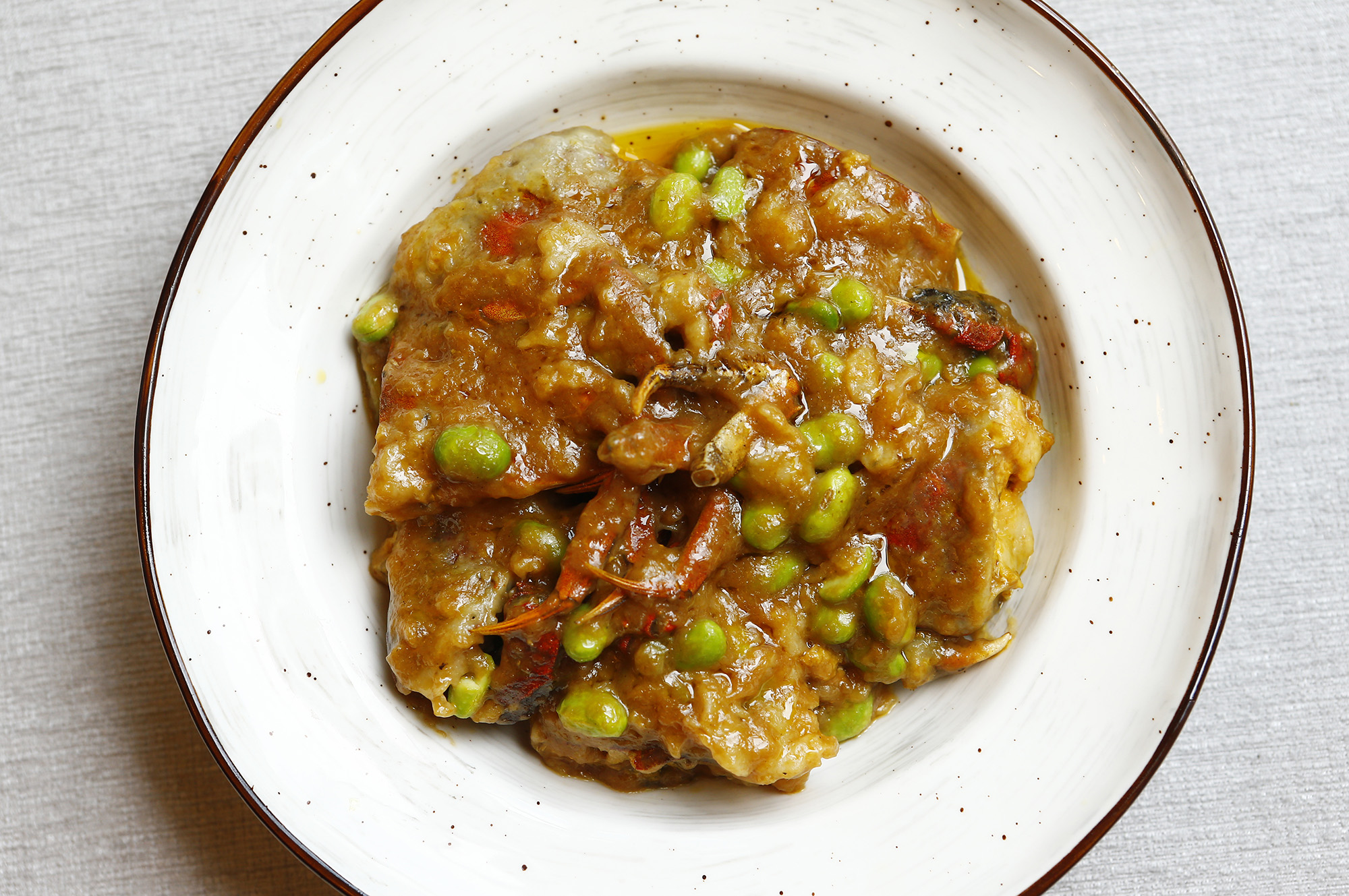 烧好的毛豆面拖六月黄看上去红中透亮,六月黄的每一寸“肌肤”都裹着一层面糊,顾不上烫嘴,忍不住用嘴嗍干净,强烈的鲜味和酱香霸占着味蕾。从切口处看去,鲜红的蟹黄已经满壳,趁热咬开螃蟹,蟹黄口感粉粉沙沙类似咸蛋黄,蟹肉入口咸、鲜、甜、滑,感觉鲜得眉毛都掉下来。相较于六月黄,嵌着毛豆的面糊更招人喜爱,吸饱了螃蟹精华鲜味十足,蟹身未动,面糊先行,一上桌就被抢了个精光。