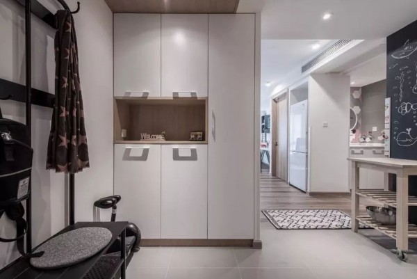 白色储物柜的设计,避免了一开门就能将客厅望到底,一定程度上保证了隐私性,同时还让空间的储物能力有所增加。