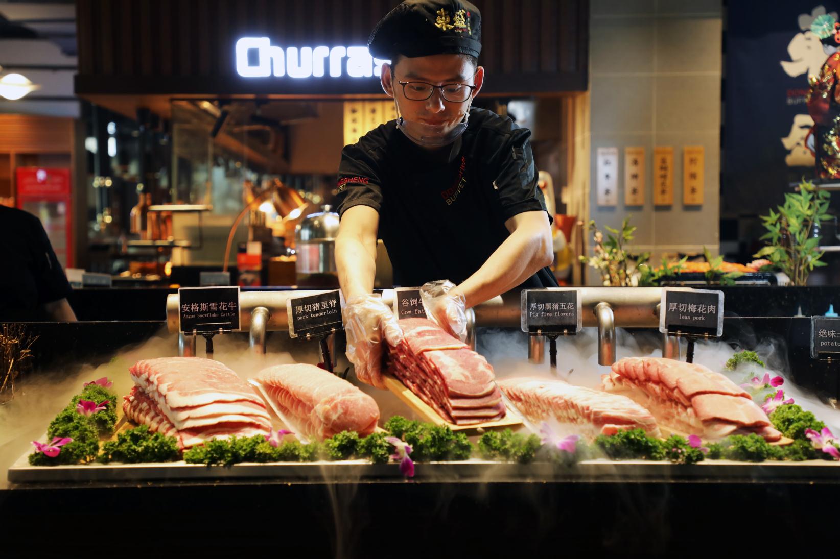 海鲜档前,每只足足有8厘米大的黑虎虾、北极红虾任你一盘接着一盘吃到爽为止。生蚝、各种鲜鱼,琳琅满目。一排排形状各异的寿司、可以随时拿取的日式铁板烧、北京烤鸭、一大盆一大盆集中摆放的西式色拉、意大利披萨、葡式蛋挞、法式蓝莓芝士蛋糕、巧克力喷泉。吃完西式后,再品尝中式点心,现包现煮的纯手工水饺、小笼、烧麦、各种包子,甚至还有现烤的羊肉串,羊肉的脂焦香混合着孜然味,撑得再饱的肚子,也不能拒绝嘴巴再咬上一口。各种现榨饮料、啤酒、水果之外,还有可爱的网红巧克力狗狗,来一份意大利冰激凌,配上些杏仁、葡萄干、奥利奥碎,这才叫满足。不!小鲜肉们说,我还要一杯现磨咖啡!小仙女们嚷嚷,我要一份雪融冰沙或休闲养生茶!