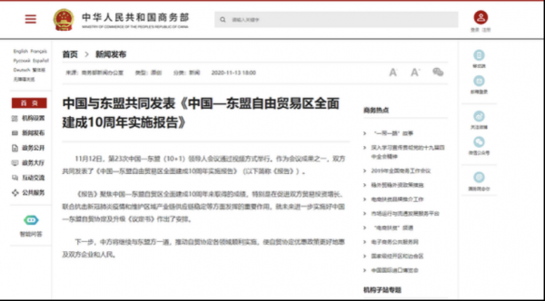 《中国-东盟自由贸易区全面建成10周年实施报告》发表 图:商务部网站截屏
