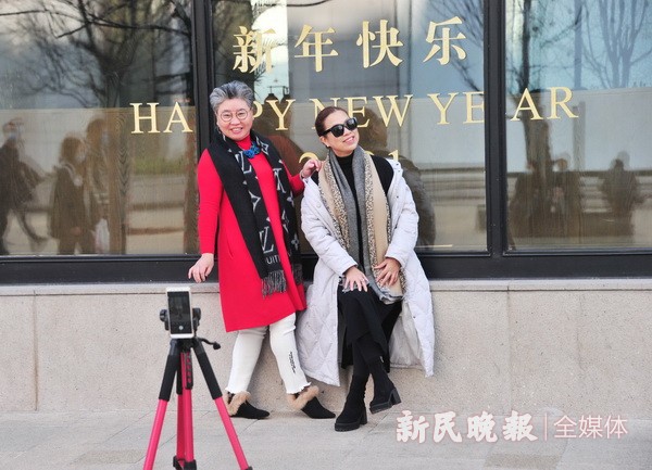 图为南京路步行街上,两位女游客在“新年快乐”字样的橱窗前自拍留影