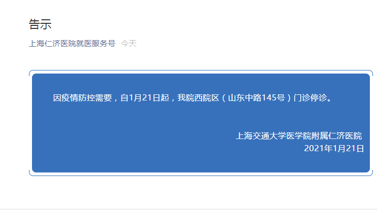因疫情防控需要,自1月21日起,我院西院区(山东中路145号)门诊停诊。